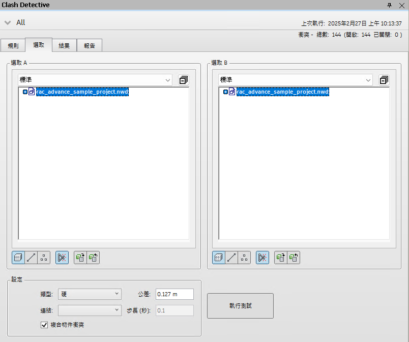 如果使用選取和搜尋集,則可以更快、更有效和更輕鬆地重複執行衝突測試。請仔細考慮需要互相衝突的物件集並相應地建立選取/搜尋集。