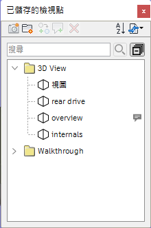 「儲存的視點」視窗是可停靠視窗,讓您跳到預設視點,不必每次導覽才能到達項目。