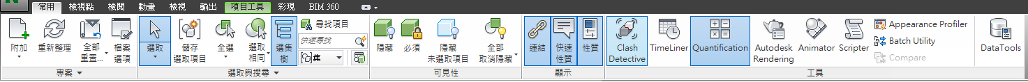 其中一些是關聯式頁籤。當您執行某些指令時,會顯示特定的關聯式功能區頁籤,而不顯示工具列或對話方塊。例如,只要您開始在「場景視圖」中選取項目,就會顯示先前隱藏的「項目工具」頁籤。未選取任何項目時,它會再次變成隱藏。