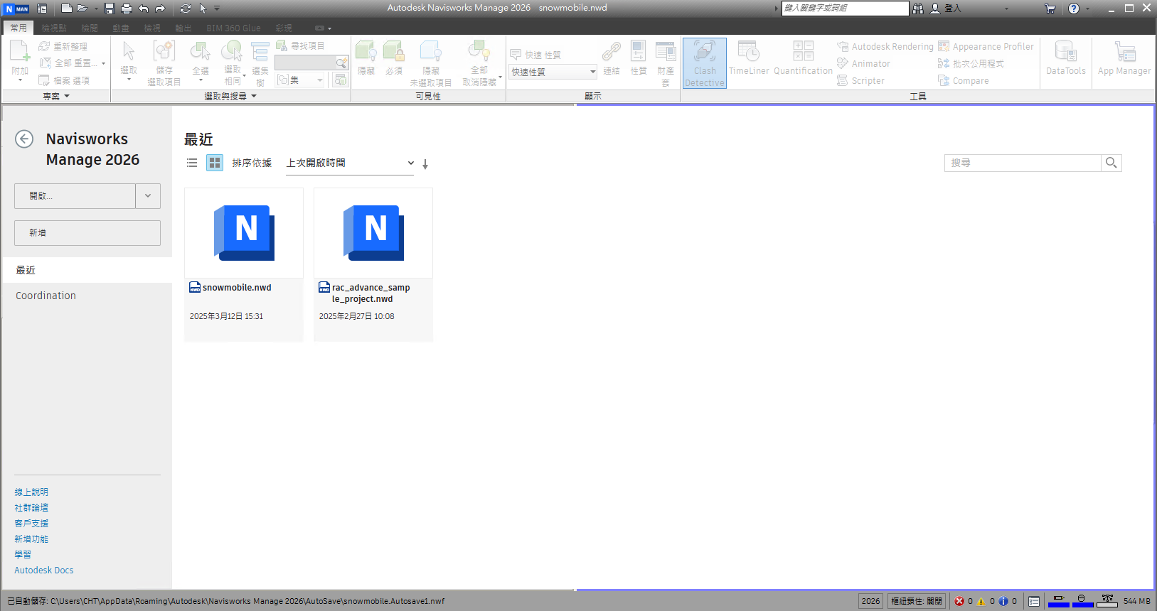 使用 Navisworks 首頁可存取和管理模型的相關資訊。