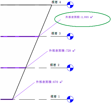 例如,假設您建立一個開始於樓層 1 並結束於樓層 4 的量體。在「量體樓板」對話方塊中,選取樓層 1、2、3 和 4。接著,Revit 會在樓層 1、2 和 3 建立量體樓板。軟體不會在樓層 4 建立量體樓板,因為樓層 4 與量體的頂部重合。此樓層沒有外部表面積 (從其周長往上延伸的垂直表面) 或體積 (從樓層 4 向上)。相反的,樓層 3 的外部表面積包括涵蓋樓層 3 的垂直表面 (牆),還有出現在樓層 4 的頂部水平表面 (屋頂)。因此,量體頂部樓板的外部表面積可能明顯大於較低的樓板。