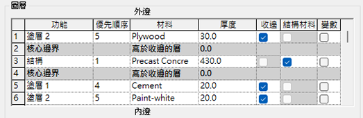 位於「編輯組合」對話方塊中「核心邊界」列之間的牆層定義牆的「核心」。使用核心中心線或核心面建立牆定位線時,會使用牆核心定義。請參閱關於牆定位線。