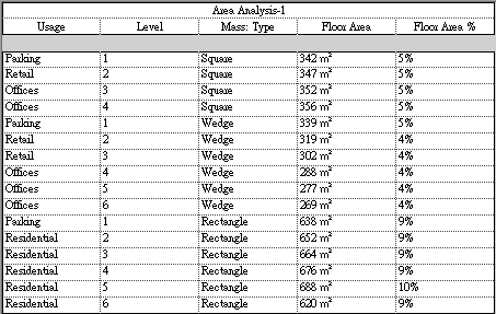 建立明細表以於概念設計中執行量體的面積分析。某些步驟可能會根據明細表中要展示的資訊而有所不同。