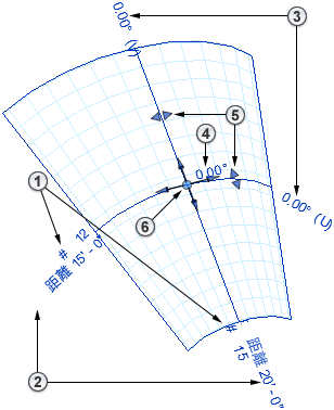 帶測量 | 按一下並拖曳這些控制,將帶沿著這些控制各自的網格重新定位。每條網格帶均表示沿地形 (從其開始測量網格之間的弦距離) 的直線。沿著曲線的距離比例會不同。 |