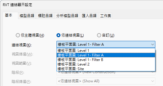 - 對於「連結視圖」,選取您要將連結模型中哪個視圖的顯示設定用於目前主體視圖中的連結模型。