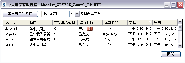 「歷程」對話方塊會顯示與 Revit 專案中央檔案有關的各動作之相關資訊。如果中央檔案存取作業失敗,請按一下 以取得失敗的相關資訊。請參閱〈如果「與中央同步」作業失敗〉。