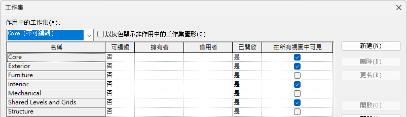 建立工作集時,可以使用「新工作集」對話方塊中的「在所有視圖中可見」選項,指出該工作集是否要顯示在模型的所有視圖中。此設定會反映在「工作集」對話方塊的「在所有視圖中可見」欄中。