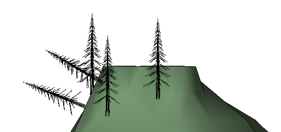 垂直族群和非垂直族群的範例;三棵樹設定為「總是垂直」,兩棵樹則未進行此設定。