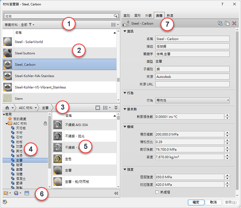 | 6 | 材料瀏覽器工具列:提供控制項來管理資源庫、建立新材料或複製既有材料,或開啟和關閉「資產瀏覽器」。 |