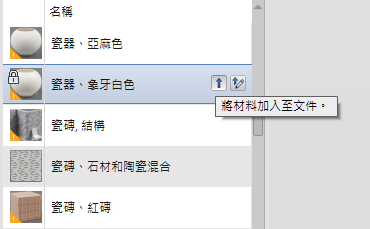 | 2 | 專案材料清單:顯示目前專案中的材料,無論其是否套用至物件。從清單中選取材料,然後按一下滑鼠右鍵來存取「更名」、「複製」和「加入至資源庫」等一般工作的功能表。 |