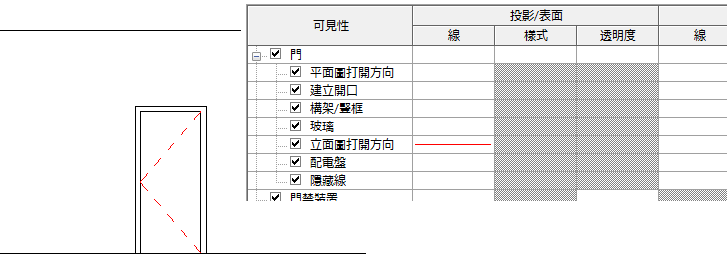 您可以使用物件型式的子品類,以控制品類中族群多個部分的可見性與圖形。例如,子品類可控制立面視圖中開門方向的可見性。在以下影像中,已取代「立面圖打開方向」子品類,以使用紅色線。
