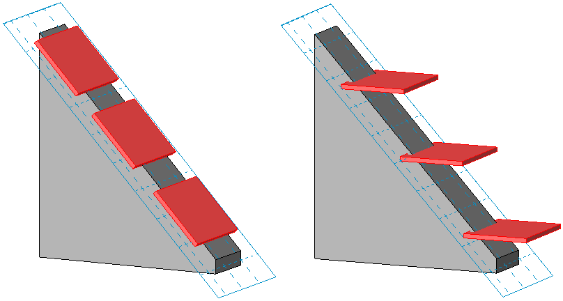 在以下的巢狀族群中,矩形擠出是以工作平面為基礎的元件。 在左圖中,擠出是以工作平面為基礎,但並非會一直呈垂直。在右圖中,指定相同的擠出為以工作平面為基礎且一律垂直後,該擠出就會重新載入族群中。