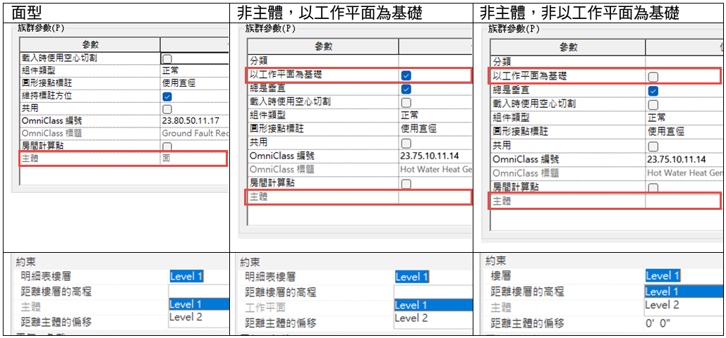 內容定義也會影響有哪個樓層相關性質可用。「以面為基礎」和「非主體,以工作平面為基礎」的元素有「明細表層次」性質值。「非主體,非以工作平面為基礎」的元素沒有「明細表層次」性質。但是它們有「樓層」性質,如下表摘要: