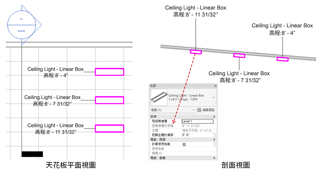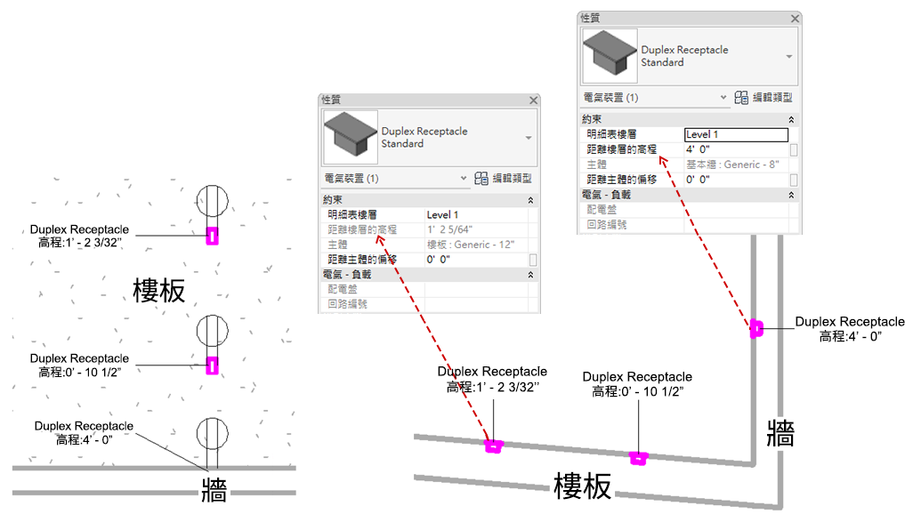 當元素放在非垂直表面上 (例如插座放在樓板上或燈具放在天花板上) 時,「距離樓層的高程」參數是不能編輯的。