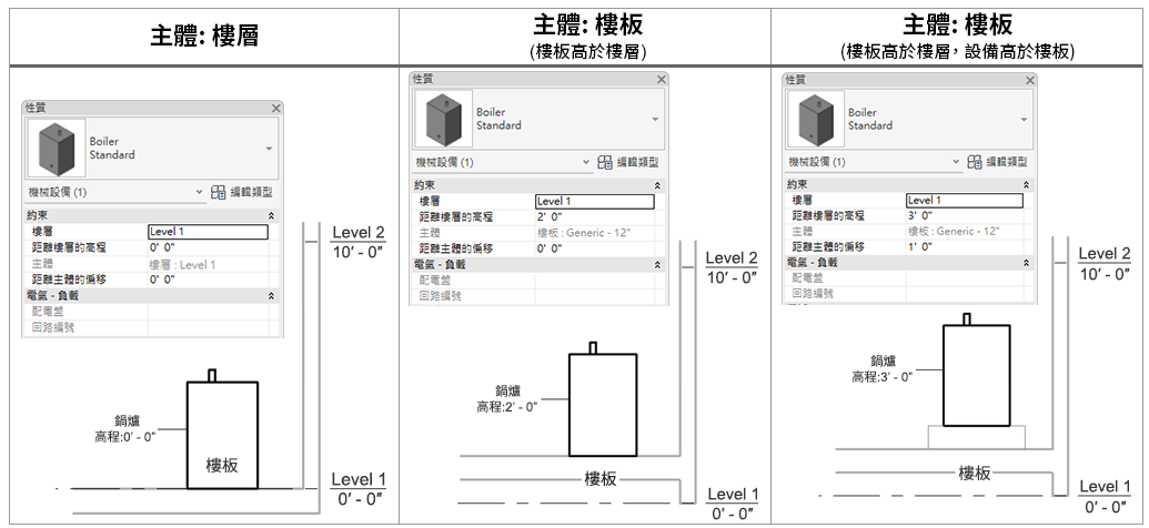 在以下範例中,樓板是在樓層上方 2' 0" 的位置。在樓板上放置鍋爐時,「距離樓層的高程」= 2' 0",「距離主體的偏移」= 0' 0"。