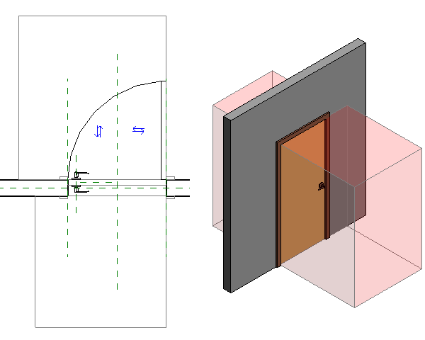 符號線使用不可見的線型式,其不會在將門放置於專案時顯示。不過,將游標移至門上或在專案中選取門,即會顯示這些線。在門的 3D 表現法中,會將擠出限制為存取間隙線。此策略可讓您使用「干涉檢查」工具,確認所有門符合存取需求。
