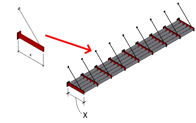 - 在壁掛式遮陽篷族群中,支撐是巢狀族群,可讓您更輕鬆地控制陣列中的幾何圖形。放置需要的支撐數目時,會根據遮陽篷的長度形成陣列。 「支撐長度」參數定義支撐從牆延伸的距離,其值需要傳遞至支撐的巢狀族群幾何圖形。