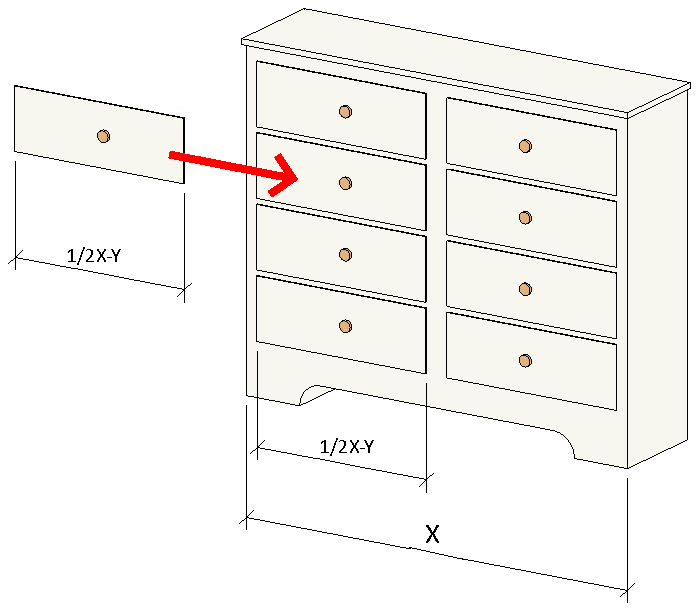 - 五斗櫃有抽屜做為巢狀族群。五斗櫃族群的「寬度」參數會傳至巢狀的抽屜族群,讓抽屜能正確地佈滿五斗櫃開口。