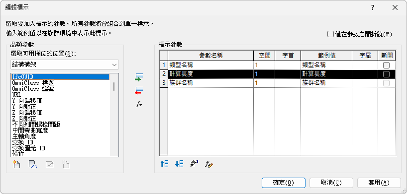 「品類參數」視窗包含與標籤類型相關的標示參數。「標示參數」視窗包含標示中顯示的「品類參數」。通常這是單一參數,但是您可以詳細建立一連串更複雜的標示。