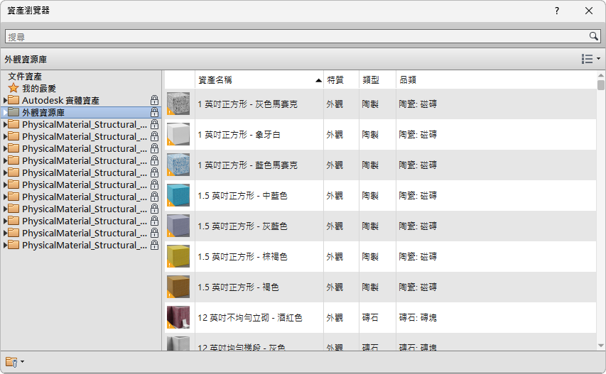 資產儲存在 Revit 專案或資源庫中。位於 Revit 專案中但未被任何材料參考的資產則會儲存至「無法參考的資產」資源庫。您可以根據需要在 Revit 工作階段期間建立和編輯未參考的資產。但是您必須儲存 Revit 專案,才能儲存在工作階段期間建立或編輯的任何未參考資產。