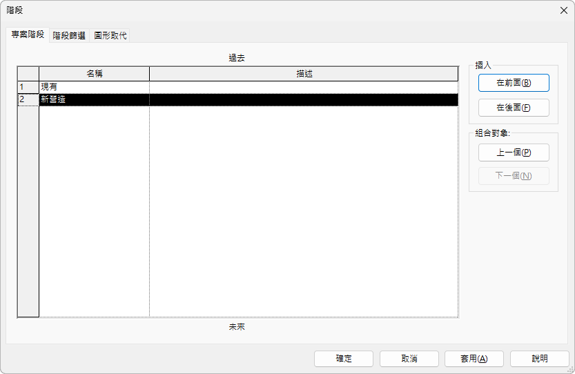 「階段」對話方塊開啟,顯示「專案階段」頁籤。依預設,每個專案均有稱為「既有」和「新營造」的階段。