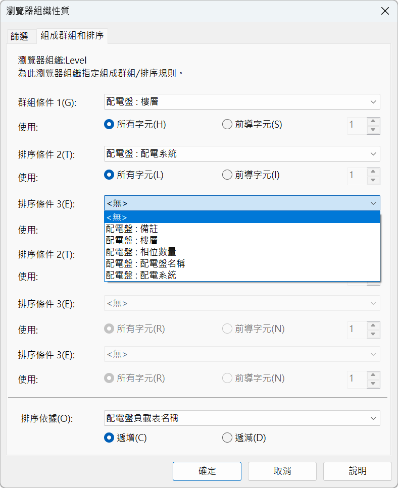 您可以依配電盤的「負載表名稱」、「配電系統」、「備註」、「樓層」、「相位數量」排序,使用配電盤負載表上的「專案參數」和「共用參數」分組和篩選,以及依「相位數量」篩選配電盤負載表。