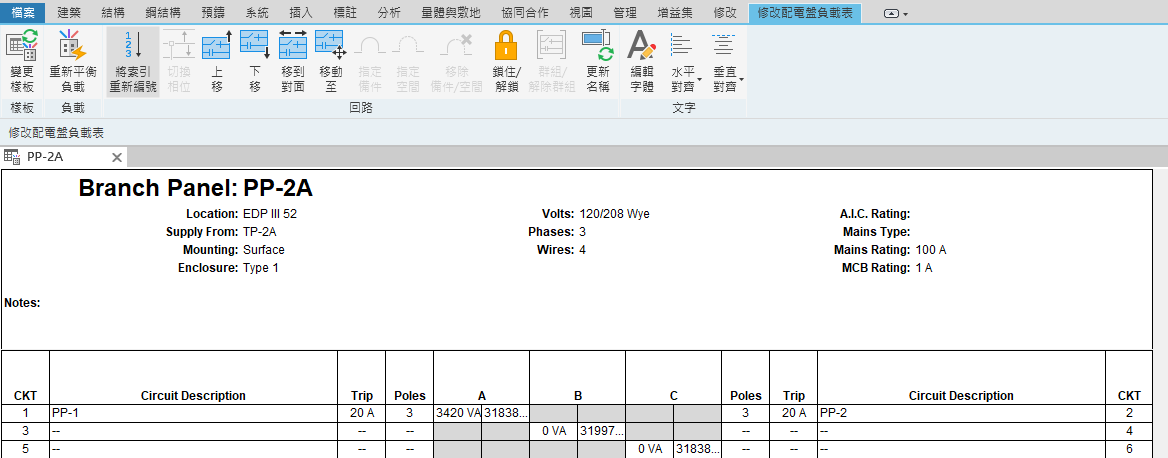當顯示配電盤負載表時,您可以重新排列配電盤上的回路,方法為上下左右移動它們,以及將它們分組並鎖住它們。您也可以平衡相位之間的負載、指定備件和空間,並更新回路名稱。