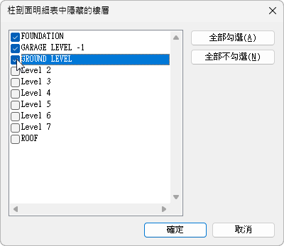 - 按一下「確定」以接受選取項目並關閉「柱剖面明細表」對話方塊中的「隱藏的樓層」。