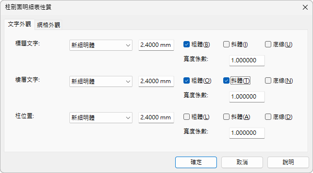 變更明細表中三種文字型式的格式:「標題」、「樓層」和「柱位置」,然後按一下「確定」。