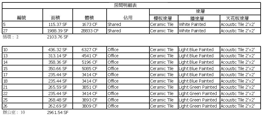 當您修改模型時,所有明細表都會自動更新。例如,如果移動一面牆,則房間明細表中的平方英呎也會相應更新。