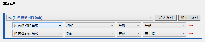 選取篩選的一個或多個品類。如果選取多個品類,定義規則時,可以使用對所有選取品類都通用的參數。