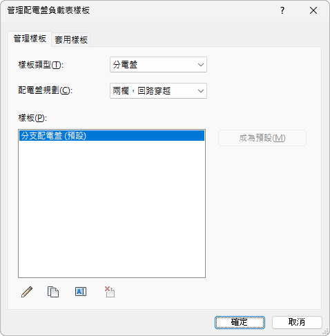 您可以使用「管理配電盤負載表樣板」對話方塊來編輯、複製、刪除和套用配電盤負載表樣板。您也可以指定預設樣板。
