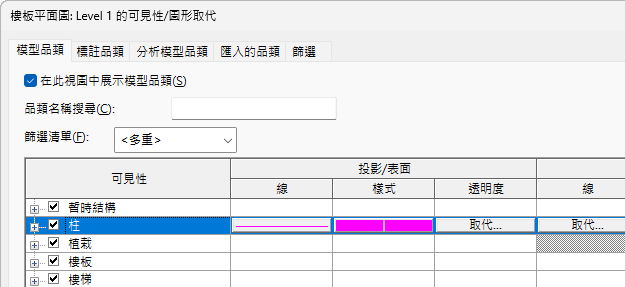 可見性與圖形顯示的大多數取代是在「可見性/圖形」對話方塊中進行的。但個別元素取代例外;此類元素的取代是在「視圖特有的元素圖形」對話方塊中進行的。