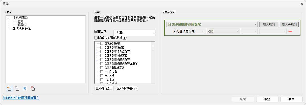 - 定義完篩選規則時,請按一下「套用」(以儲存篩選並保持對話方塊開啟),或按一下「確定」(以儲存篩選並關閉對話方塊)。