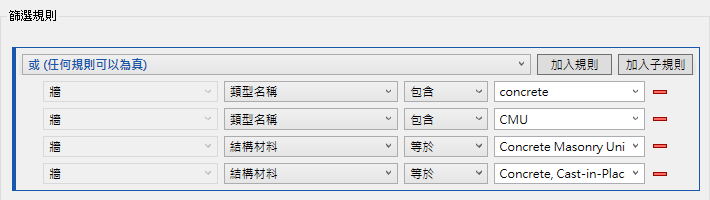 AND (「類型名稱」包含「混凝土」OR「類型名稱」包含「CMU」OR「結構材料」=「混凝土砌築單元」OR「結構材料」=「混凝土,現場澆注,灰色」)