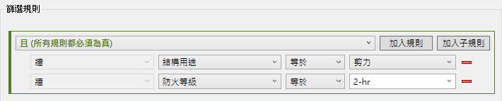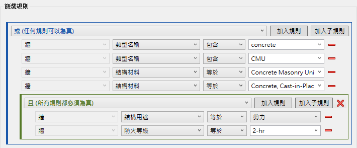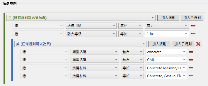 在此案例中,若要識別模型中由混凝土製成且具有 2 小時防火等級的所有剪力牆,您必須以 AND 規則集開始,然後在當中巢狀 OR 規則集,如下所示: