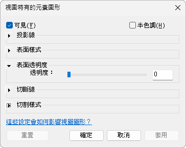 - 表面透明度:只顯示元素的線,但不顯示表面。使用「透明度」滑棒來設定表面透明度的百分比。