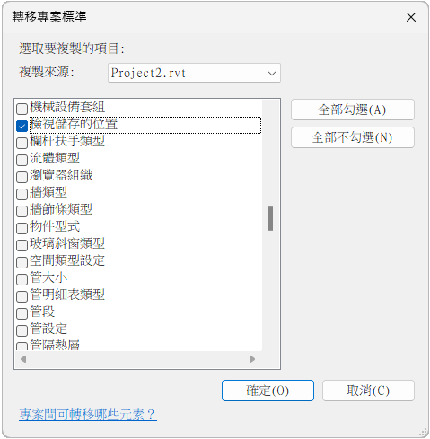 這會將所有儲存的位置轉移到指定的模型中。Revit 會檢查是否有相符的「儲存的位置」名稱,以及每個名稱中定義的值,並提示覆蓋 (如果適用)。