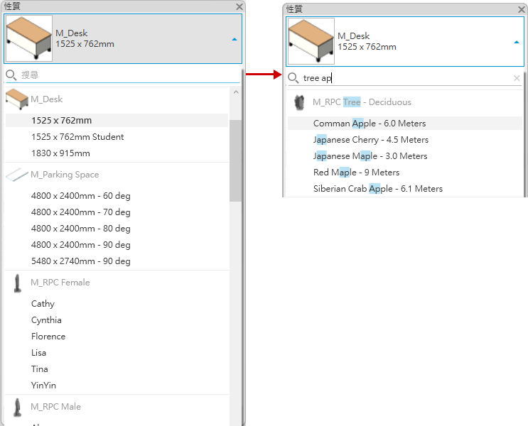 Revit 中提供搜尋功能,可讓您從較長的選項清單中更輕鬆地進行選取。您可以在以下功能領域進行搜尋: