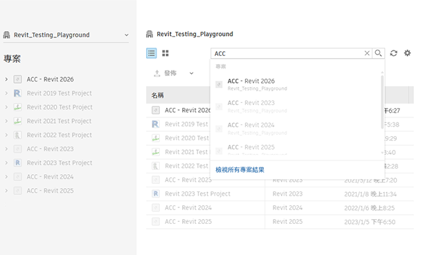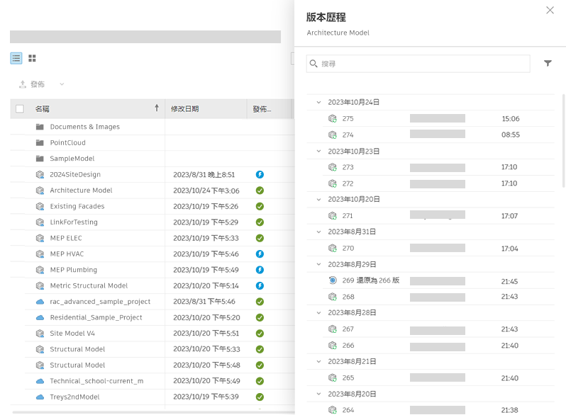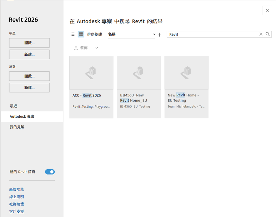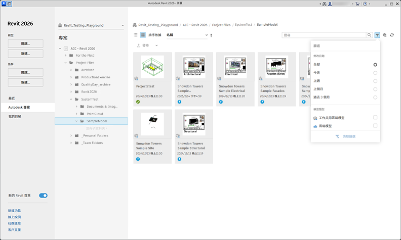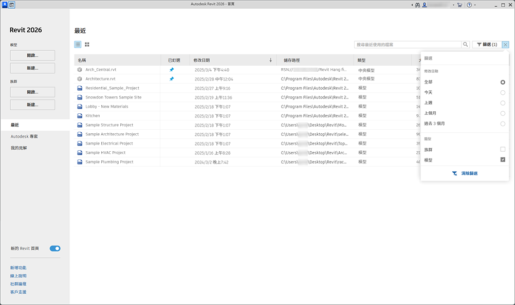 新的 Revit 首頁提供更多檢視、排序和尋找模型與版本的方法。