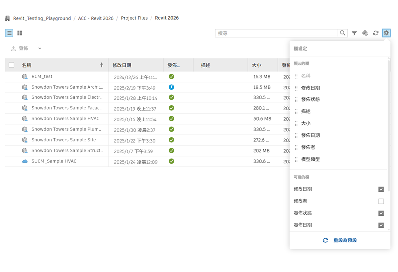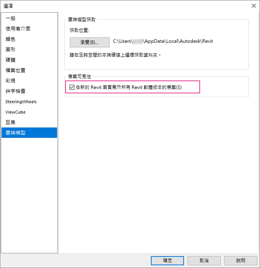 可見性功能可讓您看見所有 Revit 版本的專案。目前執行版本以外的其他 Revit 版本專案,將顯示為停用狀態。您可以開啟和關閉此功能。在「選項」對話方塊