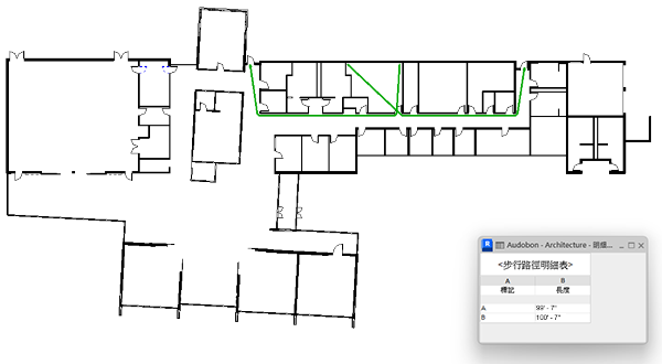 在大多數設計中,您要能夠識別必須評估哪些空間以獲得最大步行距離。使用路徑分析工具可找出實際的步行距離。影片範例中會在距離出口最遠房間的最遠角落,加入兩條步行路徑線。明細表用來列出步行線的長度。明細表會將路徑「A」識別為距最近出口的最大距離。