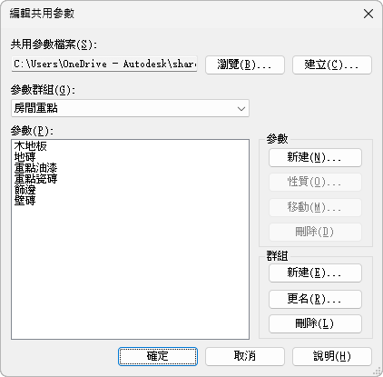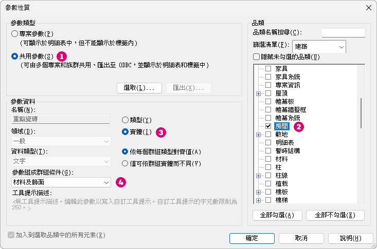 註: 共用參數必須加到專案或族群中成為實體參數,才能在關鍵資訊明細表中使用。