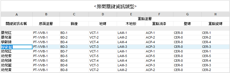 建立後,關鍵資訊明細表完全空白。它只是您要包括的參數選集。您需要為每個關鍵資訊類型建立「關鍵資訊」。每個房間類型的關鍵資訊類型及塗層套組列示如下。嬰兒、幼兒和學齡兒的房間各有不同顏色。為我們將使用的每個獨特塗層套組加入一列資料。