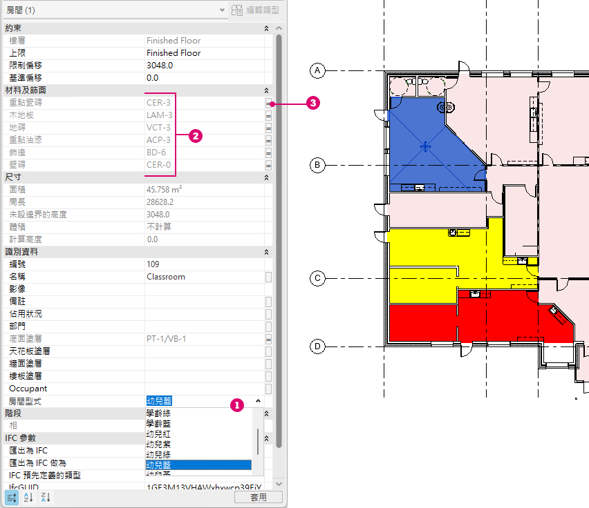 最後一步是對房間套用關鍵資訊類型。在模型中和「性質」選項板中選取房間元素或多個元素,使用「性質」選項板「識別」區段下的下拉式清單