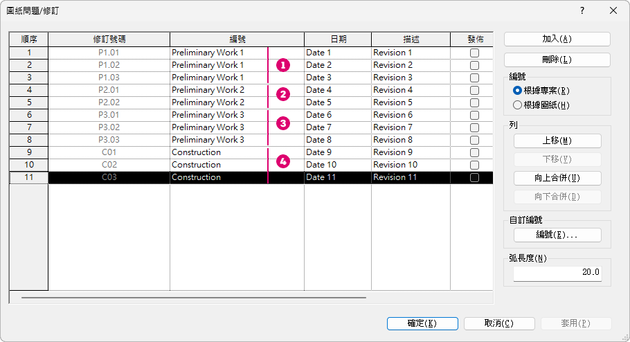 例如,假設您處理的專案需要您在設計階段追蹤修訂,並在營造階段分開追蹤修訂。每次發出一個設計檢閱套件時,修訂都會以字首 P1、P2、P3 等標示...每個修訂都會標示一個供檢閱的文件版本。在每個版本中,您都需要記錄對專案所做的細微變更。兩個設計檢閱版本之間所做的變更,會使用設計檢閱的字首後接一個兩位數字來追蹤。