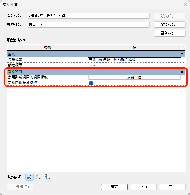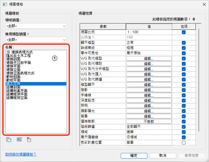 將樣板性質套用到目前視圖 - 選取樣板並將樣板的可見性設定套用到目前視圖。
