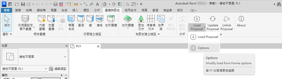 開啟 Revit 並建立新專案。在「量體與敷地」頁籤中,找到「Load Proposal」按鈕。