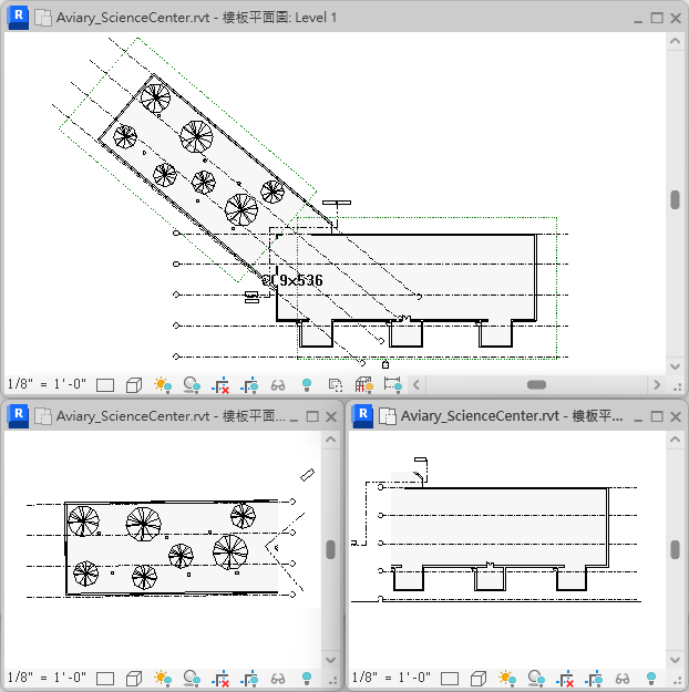 例如,在下圖中,頂部視圖展示圍繞主建築和鳥舍側翼的範圍框。範圍框 1 套用到主建築的網格線,範圍框 2 則套用到鳥舍側翼的網格線。因此,從屬視圖 (底部) 僅展示套用到建築各部分的網格線。