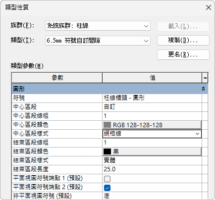 透過修改網格類型的「類型性質」,自訂網格線 。